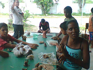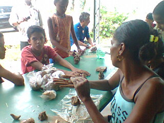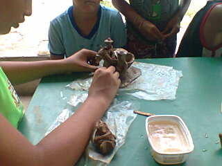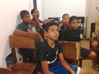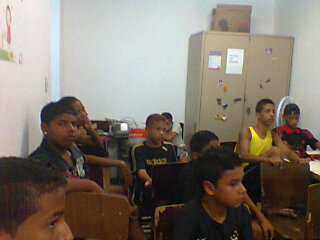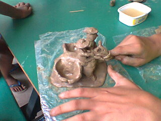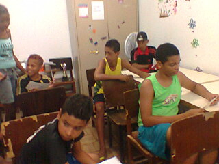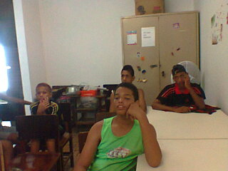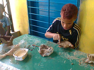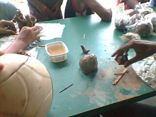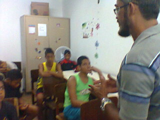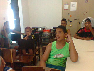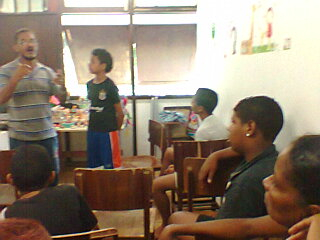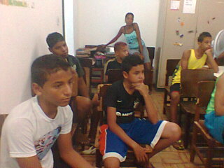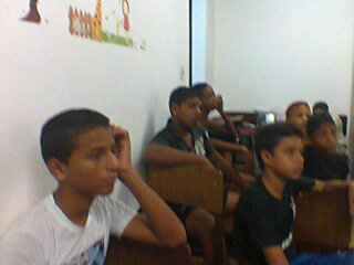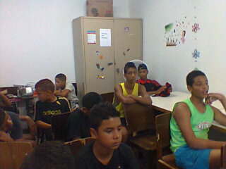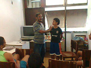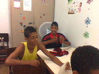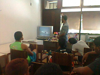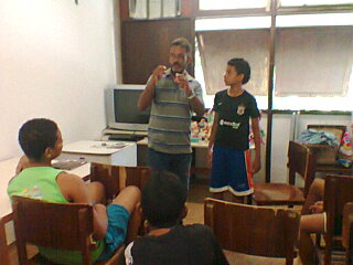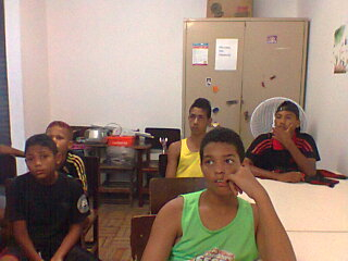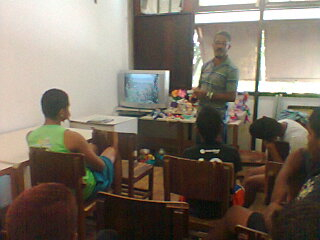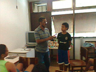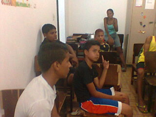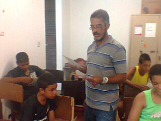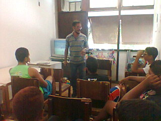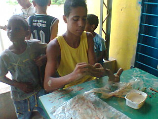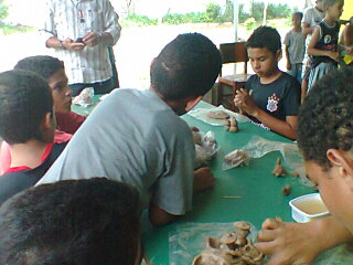 Henrique da palestra para garotos em Recife PE, falando sobre a arte do barro em Tracunhaém, mostra videos e depois leva garotos para outra área do predio para garotos fazerem peças de barro.